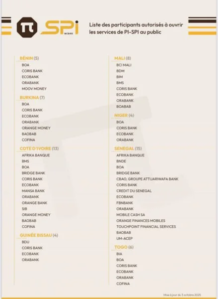 La BCEAO a publié une liste actualisée de 62 établissements autorisés à ouvrir les services PI-SPI au public dans les 8 pays de l’UEMOA.