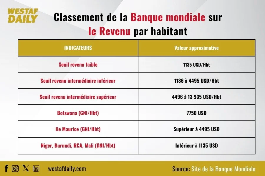 Le Botswana et l’Île Maurice dépassent le seuil du revenu intermédiaire supérieur (> 4 495 USD/habitant), tandis que le Niger, le Burundi, la République centrafricaine et le Mali restent en dessous de 1 135 USD/habitant.