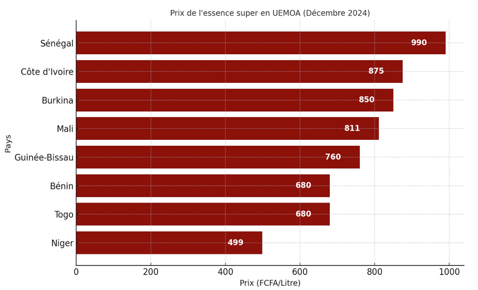 Le prix de l'essence varie fortement en Afrique de l'Ouest, du simple au double, avec le Sénégal en tête (990 FCFA/litre) et le Niger au plus bas (499 FCFA/litre).